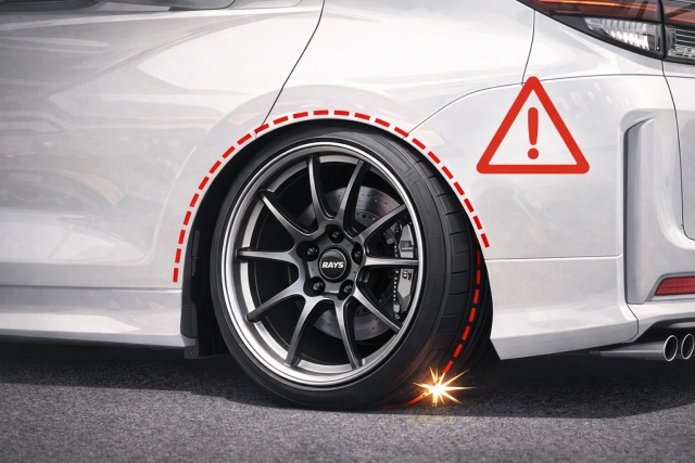 外径が大きくなるほど、フェンダー・インナー樹脂・サスペンション周辺に近づき、走行時に干渉が発生するリスクが高まります。