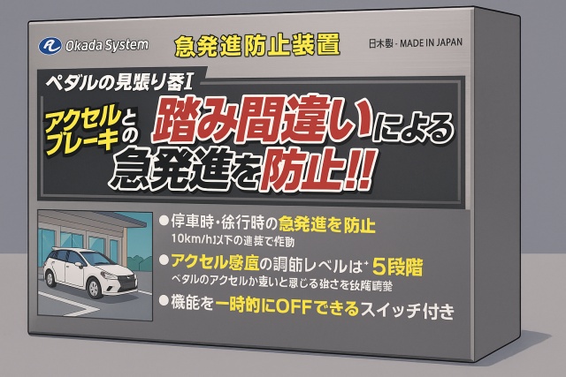 アクセルとブレーキの踏み間違いによる急発進防止装置である「ペダルの見張り番Ⅱ」です。