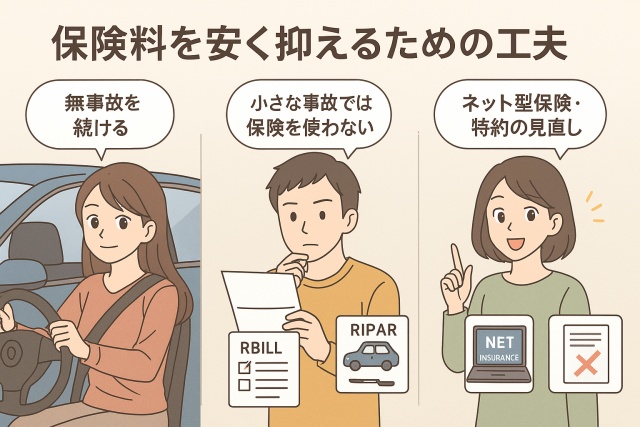 まず大切なのは、無事故を続けて等級を上げること。等級が高くなれば割引率が増し、長期的には大きな節約につながります。また、小さな事故の際に「本当に保険を使うべきか?」を考えることも重要です。修理費が軽微であれば、自腹で対応する方が結果的に得になる場合もあります。