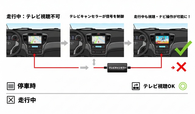 テレビキャンセラーは、これらの信号にバイパスや疑似信号を送ることで、「停止中」と車両側に誤認識させ、映像再生を可能にするという仕組みです。