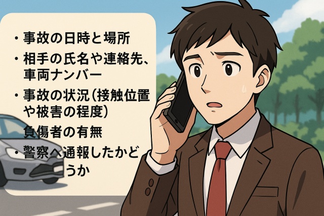 事故の日時と場所 相手の氏名や連絡先、車両ナンバー 事故の状況(接触位置や被害の程度) 負傷者の有無 警察へ通報したかどうかこれらの情報を正確に伝えることで、保険会社は迅速に対応を開始できます。あなたは、事故時に必要な情報をすぐに整理して伝えられる準備ができていますか?