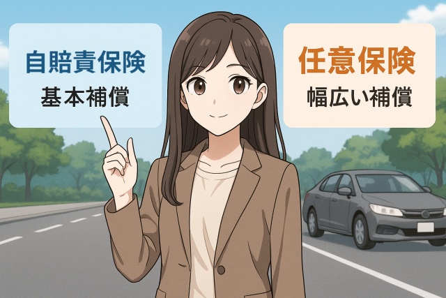 自動車保険には、大きく分けて「自賠責保険(基本補償)」と「任意保険」の2種類があります。