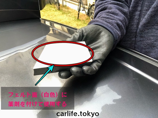 - スポンジのフェルト面(白色)に薬剤を付ける