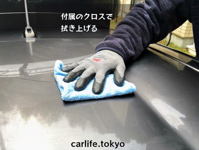 - 薬剤が乾かないうちに、付属のクロスを水で濡らし軽く絞って拭き上げる