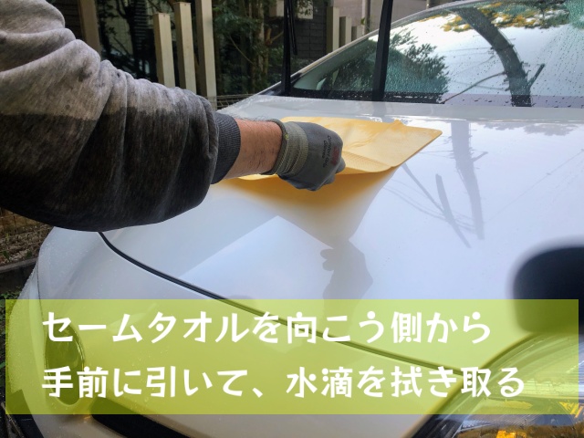 ボンネットやルーフなどの大きな箇所は、まずセームタオルで多い水滴を拭き上げる