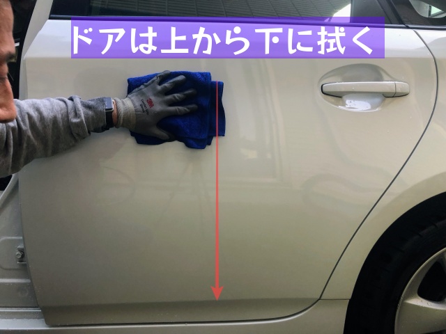 ドアは上から下に向かって拭いていきます。これも車のボディのプレスラインに沿ってふくことで塗装面にやさしい拭き上げができるというものです。また、上から下に拭き上げる理由は、水滴が流れ落ちる方向に向かって拭き取っていくと作業がやりやすいからなのです。