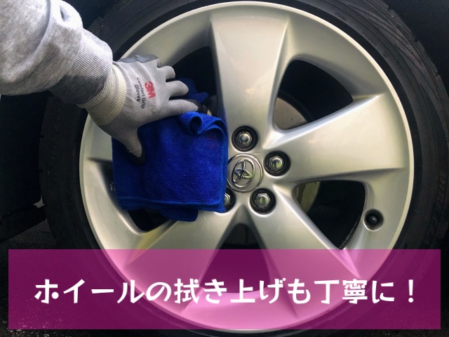 ホイールまでは拭き上げなくても…という方もおられるかもしれませんが、ホイールの水滴を放置しておくと「白サビ」が発生してしまう恐れがあるので、丁寧に拭き上げをしましょう。