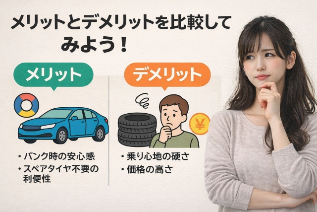 しかし一方で、標準タイヤに比べて価格が高く、乗り心地が硬めになる傾向があるほか、修理が難しく交換対応になる場合が多いなど、明確なデメリットも存在します。また、販売店によっては在庫が限られているため、万が一の際にすぐ入手できないケースも考えられます。