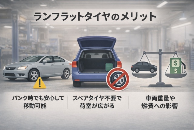 パンクしても一定距離を走行できるため、急なトラブル時でも安全に移動できるのは大きな強みです。さらにスペアタイヤを搭載する必要がないため、車両の荷室を有効に使える点も注目されています。