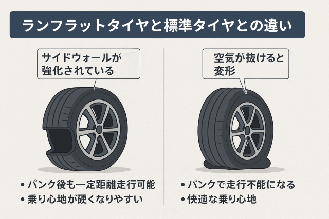 ランフラットタイヤと標準タイヤの大きな違いは「パンク後の走行性能」にあります。
