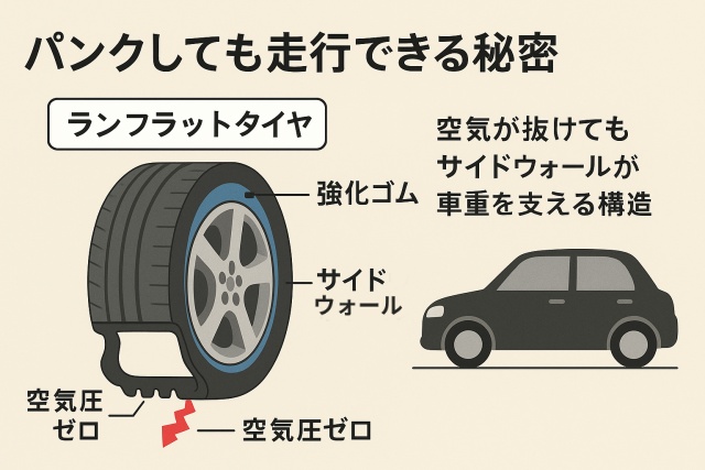 ランフラットタイヤとは、パンクしても一定距離を走行できる特殊な構造を持ったタイヤです。