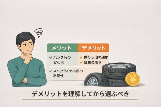 標準タイヤと比較すると購入価格が割高で、さらにパンク修理ができず交換対応となるケースが多いため、長期的には維持費が増える可能性があります。また、特殊な構造ゆえに取り扱える店舗が限られており、緊急時に交換費用が予想以上に高くなることも少なくありません。