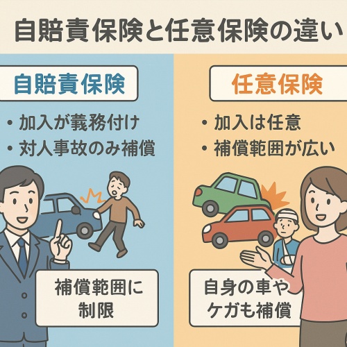 自動車保険は「自賠責保険」と「任意保険」の2種類に分かれ、それぞれ役割が異なります。