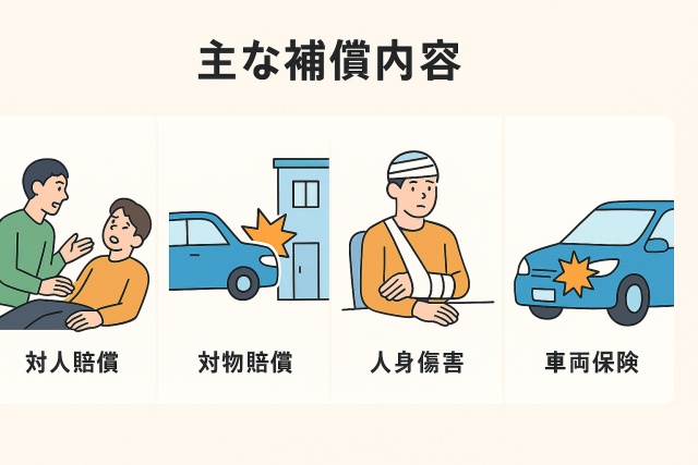 自動車保険には、さまざまなリスクに備えるための補償が用意されています。