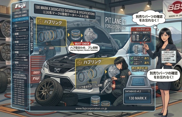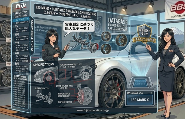 長年、数多くの130系マークXにホイールを供給してきたフジ・コーポレーションだからこそ、適合データ(マッチング)の正確性は群を抜いています。