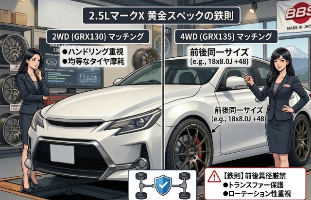 2.5Lモデルにおいて、FR(GRX130)と4WD(GRX135)では、ホイール選びの「考え方」が決定的に異なります。