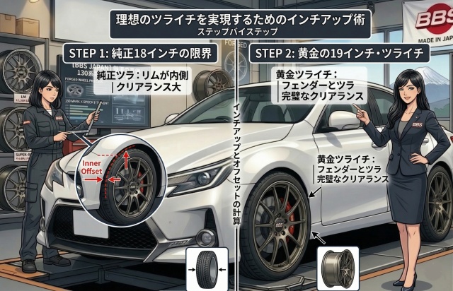 この「軽さ」というマージンがあるからこそ、タイヤの扁平率を下げても乗り心地の悪化を最小限に抑え、路面に吸い付くような「理想のツライチ」を実現できるのです。