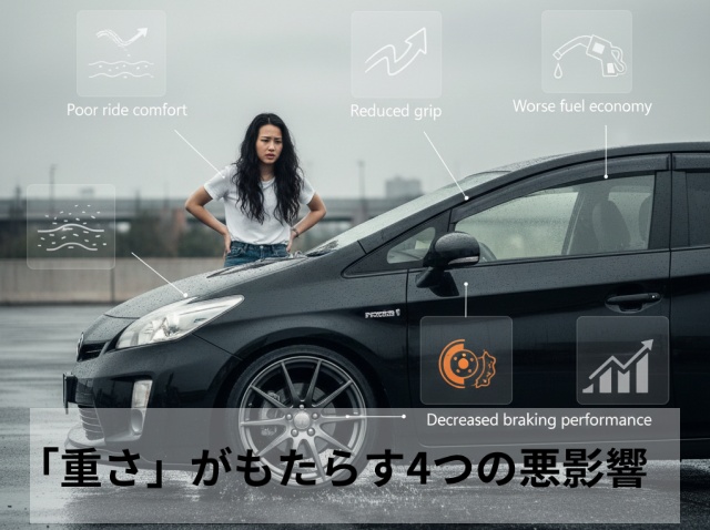 重いホイールを回し始めるには、より大きなエネルギーが必要となるため、発進時に電気モーターの消費電力が増え、エンジンが始動する頻度が高くなります。ストップ&ゴーが多い街乗りでは、顕著に燃費数値が低下する原因となります。