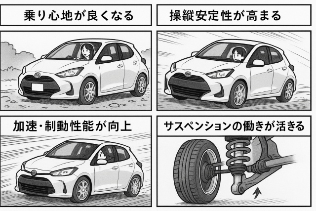バネ下重量が軽くなることで、以下のようなメリットを享受することができます。