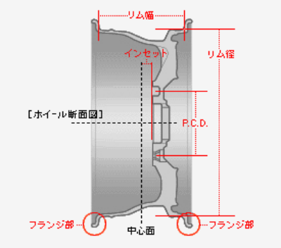 フランジ部 ホイールとタイヤが接合する部分のことを言います。ホイールのリムのフランジ部の形状には種類があります。販売されているホイールのフランジ形状は、JまたはJJが一般的です。