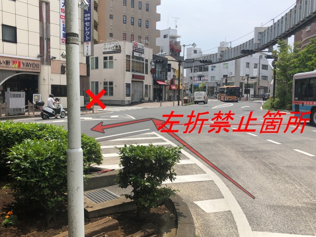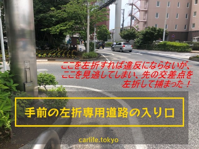 上記の画像の左折専用道路に気づいていれば、その先の交差点を左折してしまい、左折禁止違反で捕まることは無かったはずなのです。しかし、駅前のロータリーに来たときは、交差点を直進して自宅に帰るのがほとんどであり、左折したことが無かったので、手前に左折専用道路があり、交差点は左折禁止であることに気づかなかったのです。