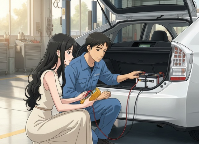 プリウスには走行用のメインバッテリーとは別に、システムを起動させる「補機バッテリー」が搭載されています。これが寿命を迎えると、ハイブリッドシステム自体が起動しなくなるため、車検時のチェックは必須です。