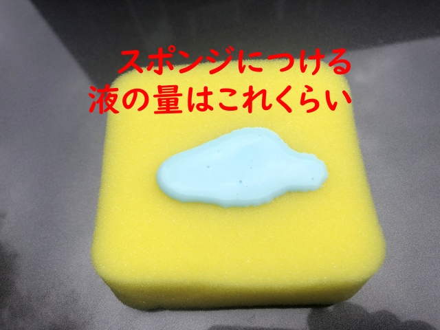 塗り方は、縦と横を繰り返し塗布していきます。スポンジで優しく擦っていきます。決して強く擦ってはいけません。強く擦ると塗装面を傷めてしまいます。水垢を浮き上がらせるイメージで優しく繰り返し擦ります。