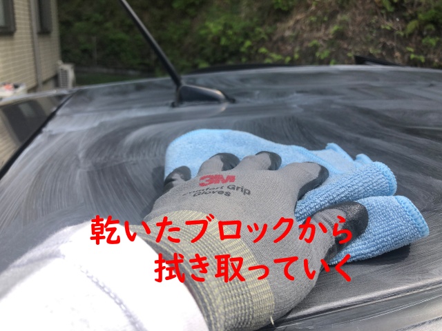乾いたところからマイクロファイバークロスなどの柔らかい布でコンパウンドを拭き上げていきます。乾きが早い場合は、塗布したブロックごとに塗布が終わった直後に拭き上げても良いでしょう。