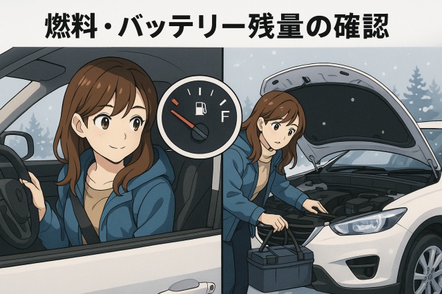 冬の雪道では、燃料やバッテリー残量の確認が特に重要です。