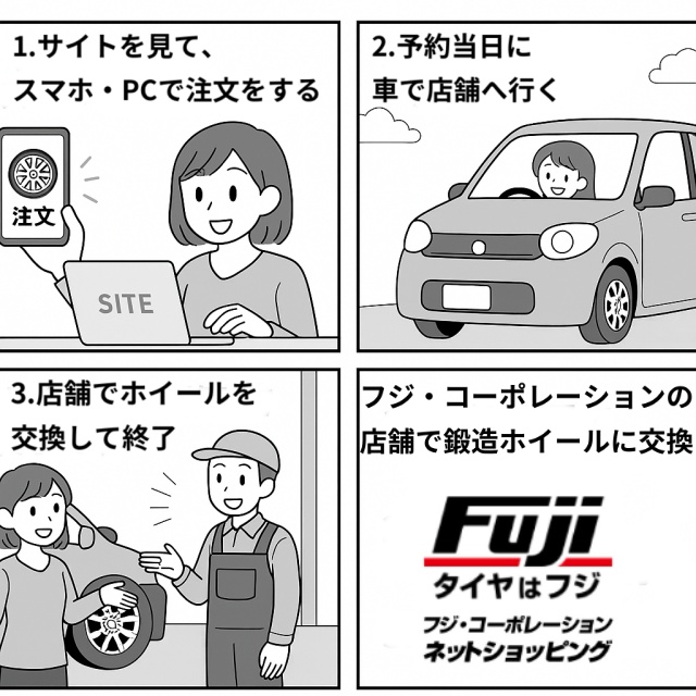 フジ・コーポレーションなら、欲しいホイールをネットで注文~店舗で取付まで、ワンストップサービスで行えます。フジ・コーポレーションの主な特徴は以下の通りです。