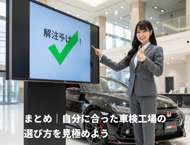 どちらの工場にもメリット・デメリットがありますが、「車検のスピードを重視したい」「その場で完了させたい」場合は指定工場、「費用を抑えつつ柔軟に相談したい」場合は認証工場がおすすめです。