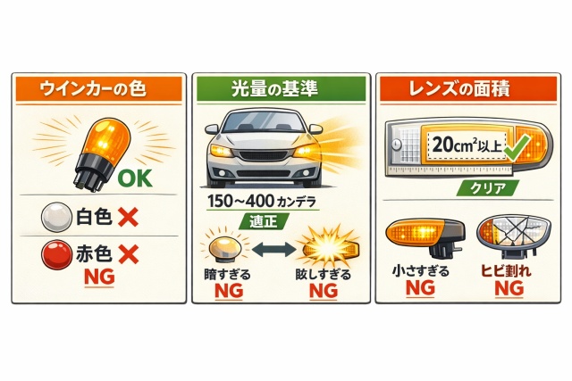 ウインカーに関する保安基準は意外と厳格で、色・光量・面積・点滅周期・視認距離・取り付け位置などが細かく定められており、これを1つでも満たしていないと車検には通りません