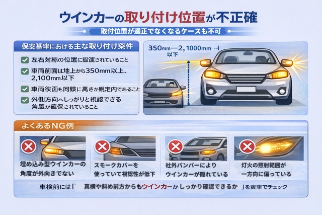 ウインカーは「取り付け位置」も保安基準で厳密に定められており、位置や角度がズレていると車検に通らない可能性があります。