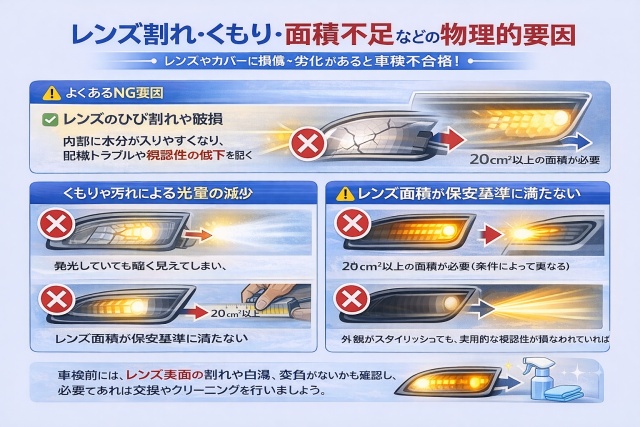 LEDウインカーが正常に点灯していても、レンズやカバーに損傷・劣化があると、車検で不合格になる可能性があります。